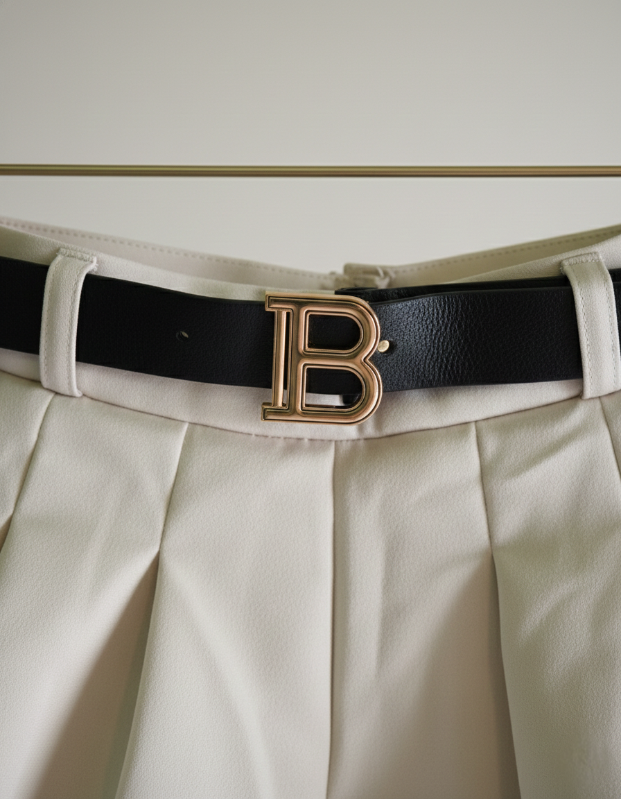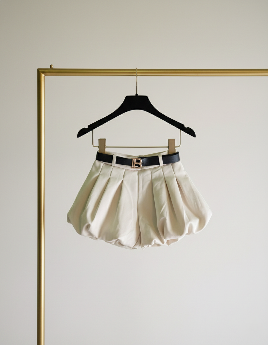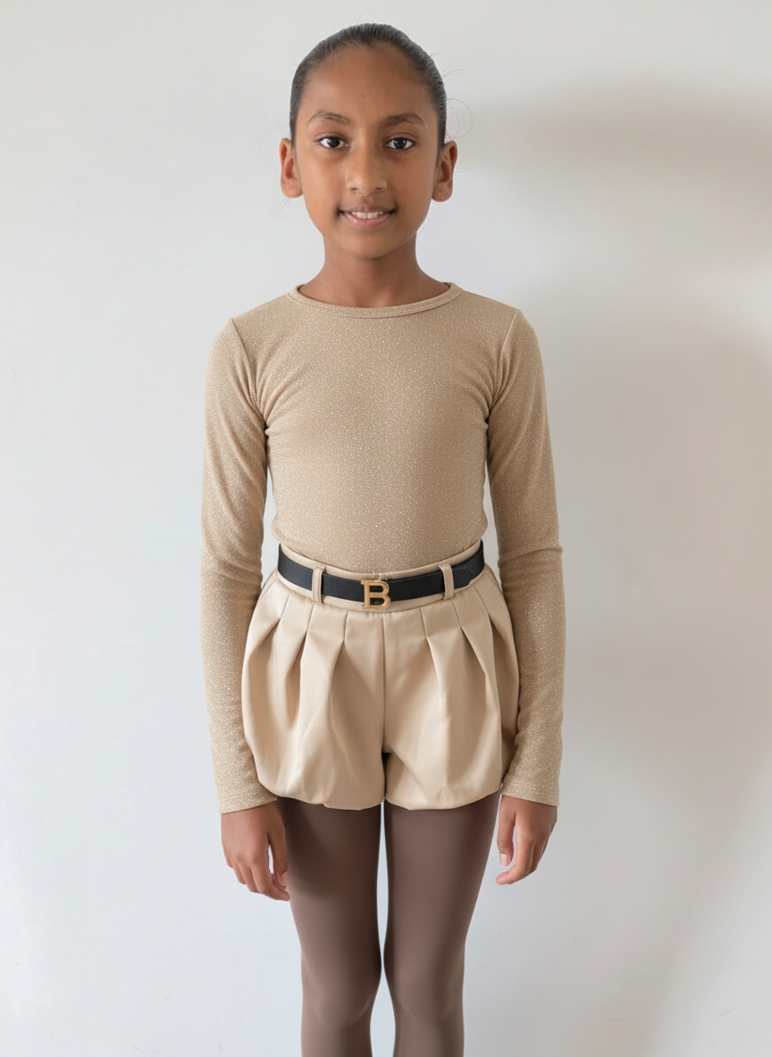 Deze stijlvolle beige broekrok voor meisjes combineert het speelse van een rokje met het gemak van een broek. De plooien geven een chique uitstraling en de zwarte riem met gouden gesp maakt de look helemaal af.