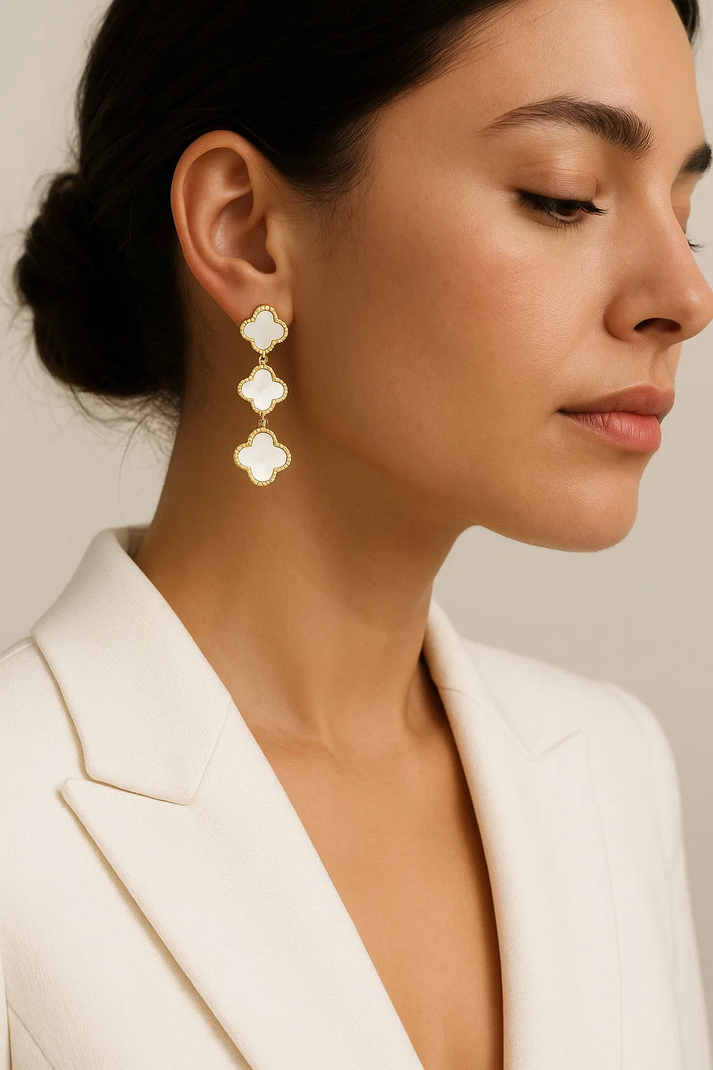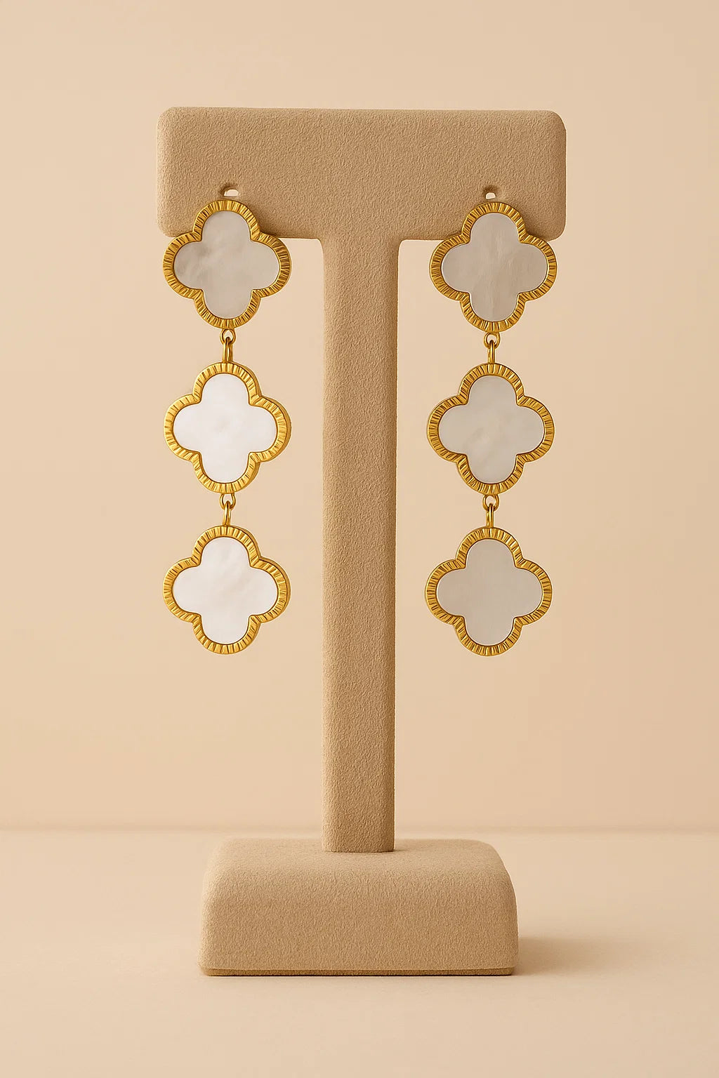 Chique clover oorbellen met een goudkleurige rand en glanzende natuurlijke shell-inleg. Elke oorbel bestaat uit drie gestapelde klavervormige elementen, geïnspireerd op luxe designerstijl. Elegant, lichtgewicht en perfect voor een verfijnde look.