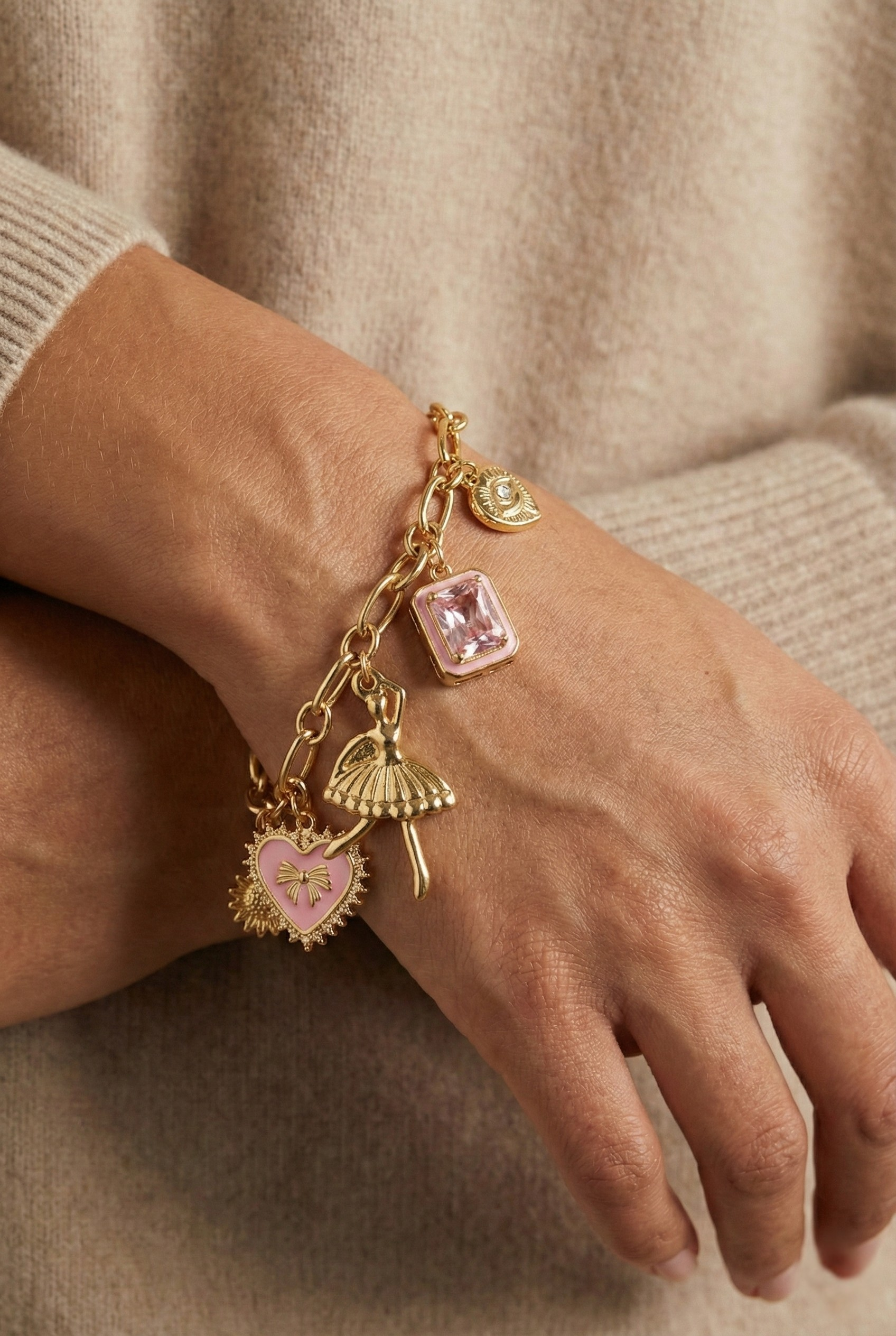 Deze goudkleurige bedelarmband straalt speelsheid en vrouwelijkheid uit door de combinatie van unieke hangers. De armband is versierd met een ballerina, hartjes, roze details en een sprankelende steen. De grove schakels geven de armband een trendy uitstraling, terwijl de verschillende bedels zorgen voor een vrolijke en opvallende look.