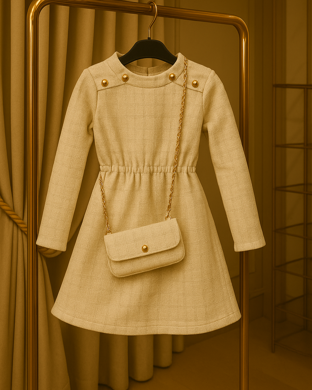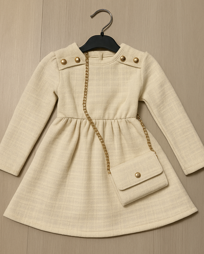 Stijlvolle beige meisjesjurk met gouden knoopdetails op de schouders en bijpassend schoudertasje met ketting.