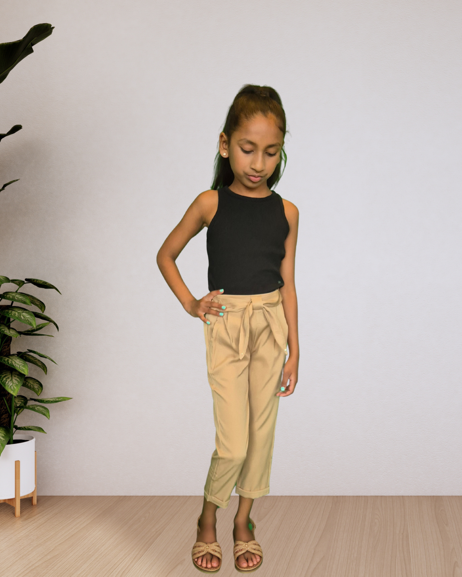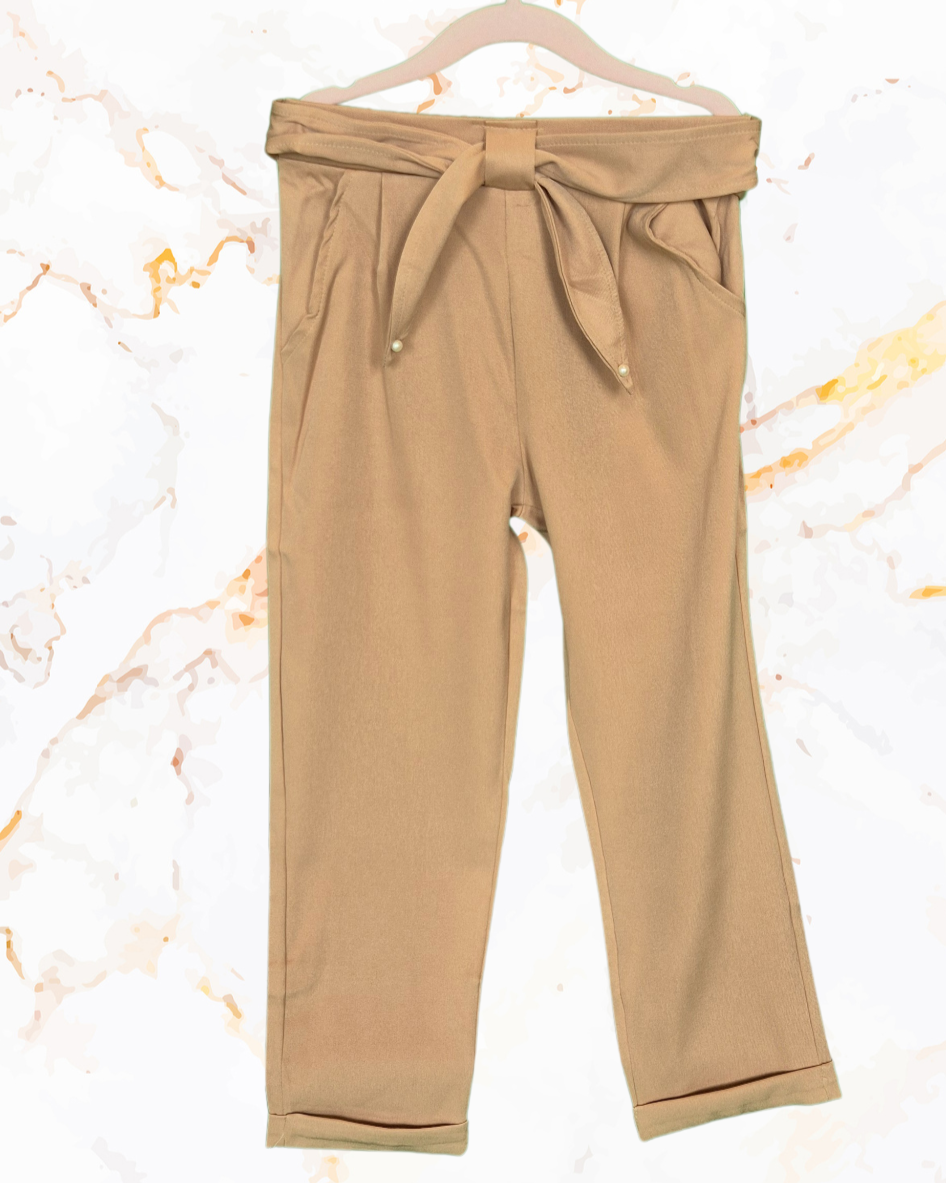 Deze prachtige beige meisjesbroek met strikceintuur is een perfecte mix van stijl en comfort. De rechte pijp en elegante tailleband maken deze broek ideaal voor zowel casual als nette gelegenheden.
