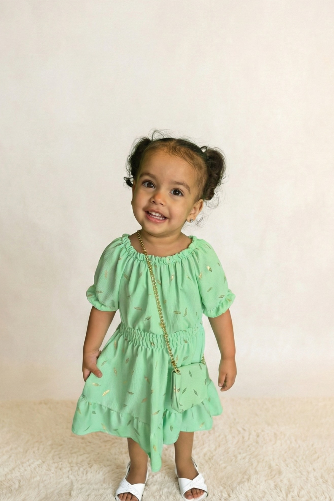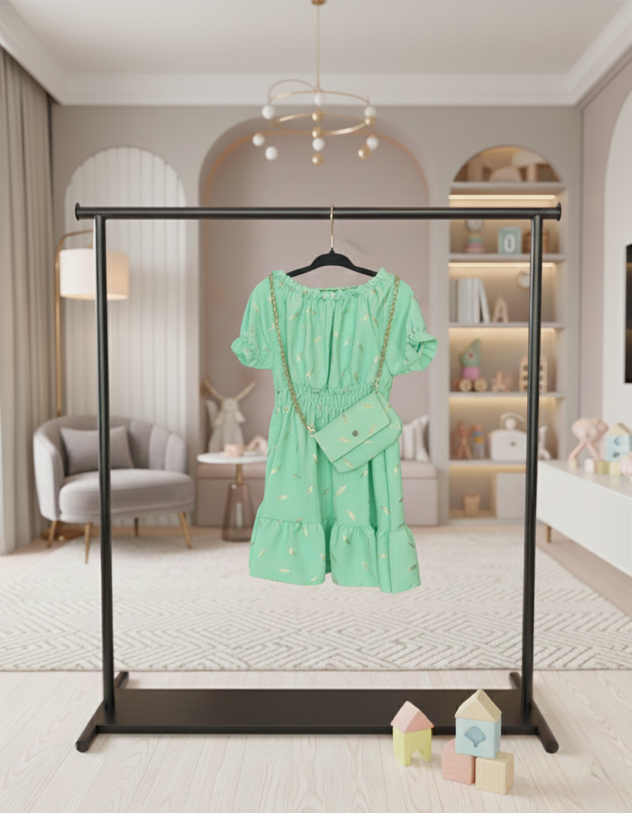 Laat je kleine fashionista stralen in deze stijlvolle meisjesjurk met een subtiele gouden bladprint. De jurk heeft een elegante afwerking met ruches en een elastische taille en hals voor een perfecte pasvorm. Het bijpassende schoudertasje met goudkleurige ketting maakt deze outfit compleet