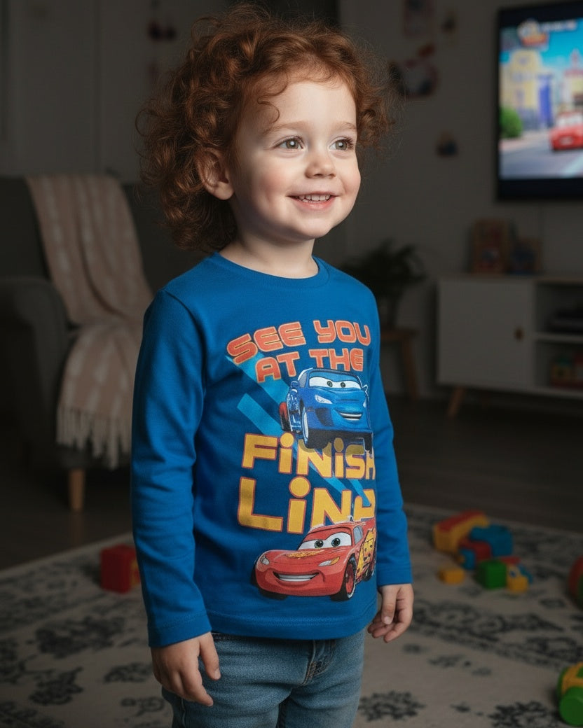Dit stoere jongens shirt met Disney Cars print is perfect voor kleine fans van Bliksem McQueen en zijn vrienden. De opvallende tekst "See You at the Finish Line" en de heldere kleuren maken het shirt extra leuk. Dankzij het zachte materiaal en de lange mouwen is het geschikt voor zowel school als vrije tijd.