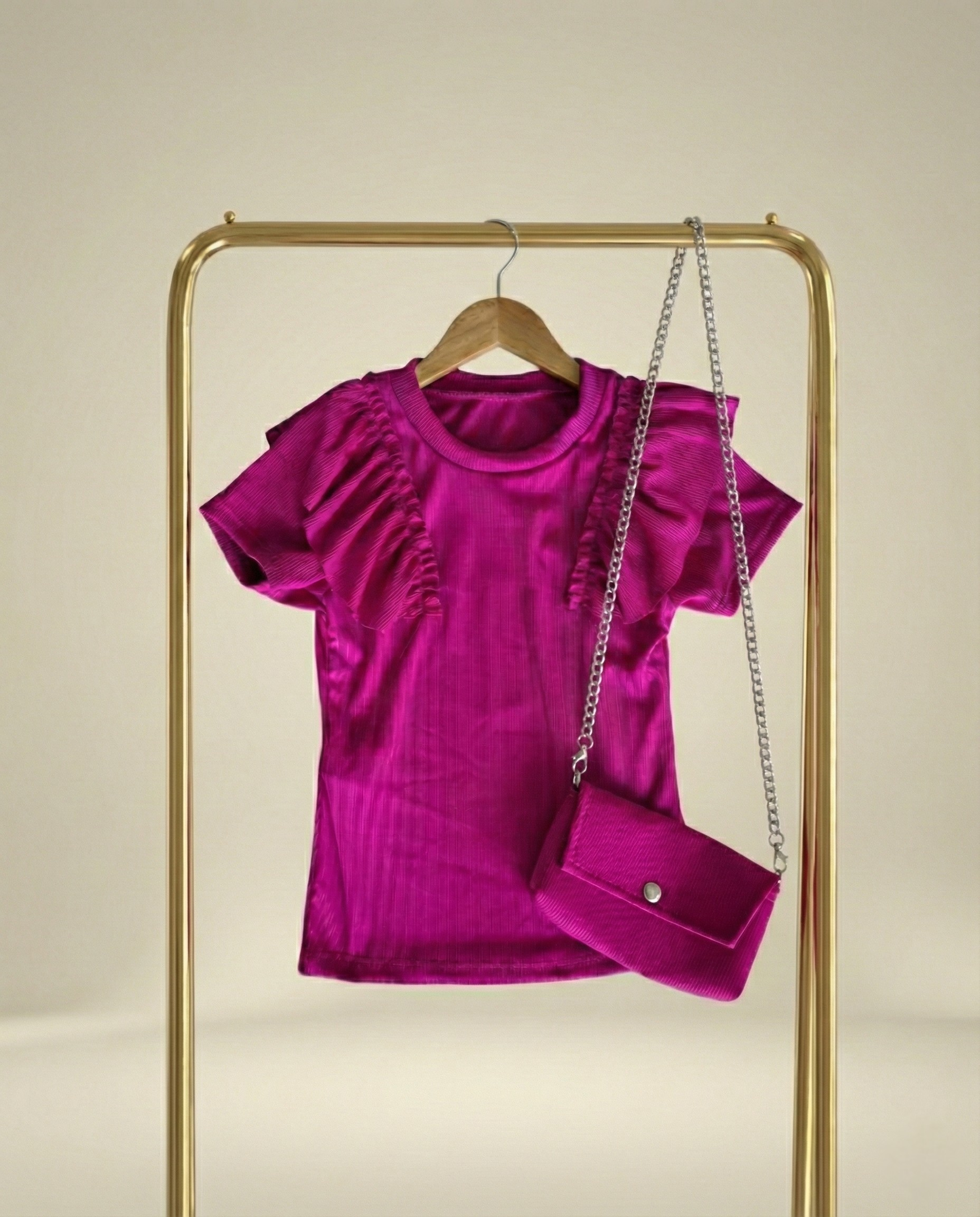 Gemaakt van een zachte, rekbare ribstof die comfortabel aanvoelt op de huid. De ruffle-mouwen geven een elegante flair, terwijl het tasje met zilverkleurige ketting zorgt voor een complete look – perfect voor een feestje of een dagje uit!